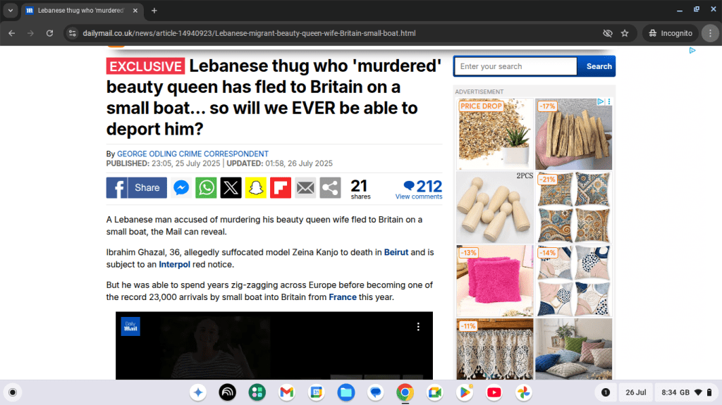 I was not surprised to see another story about illegal migration into the UK, but I am surprised how surfaced it was, and how based on the victim in Lebanon ( more in sort of gossip) than in the extremely scary prospect of future victims here in the UK.